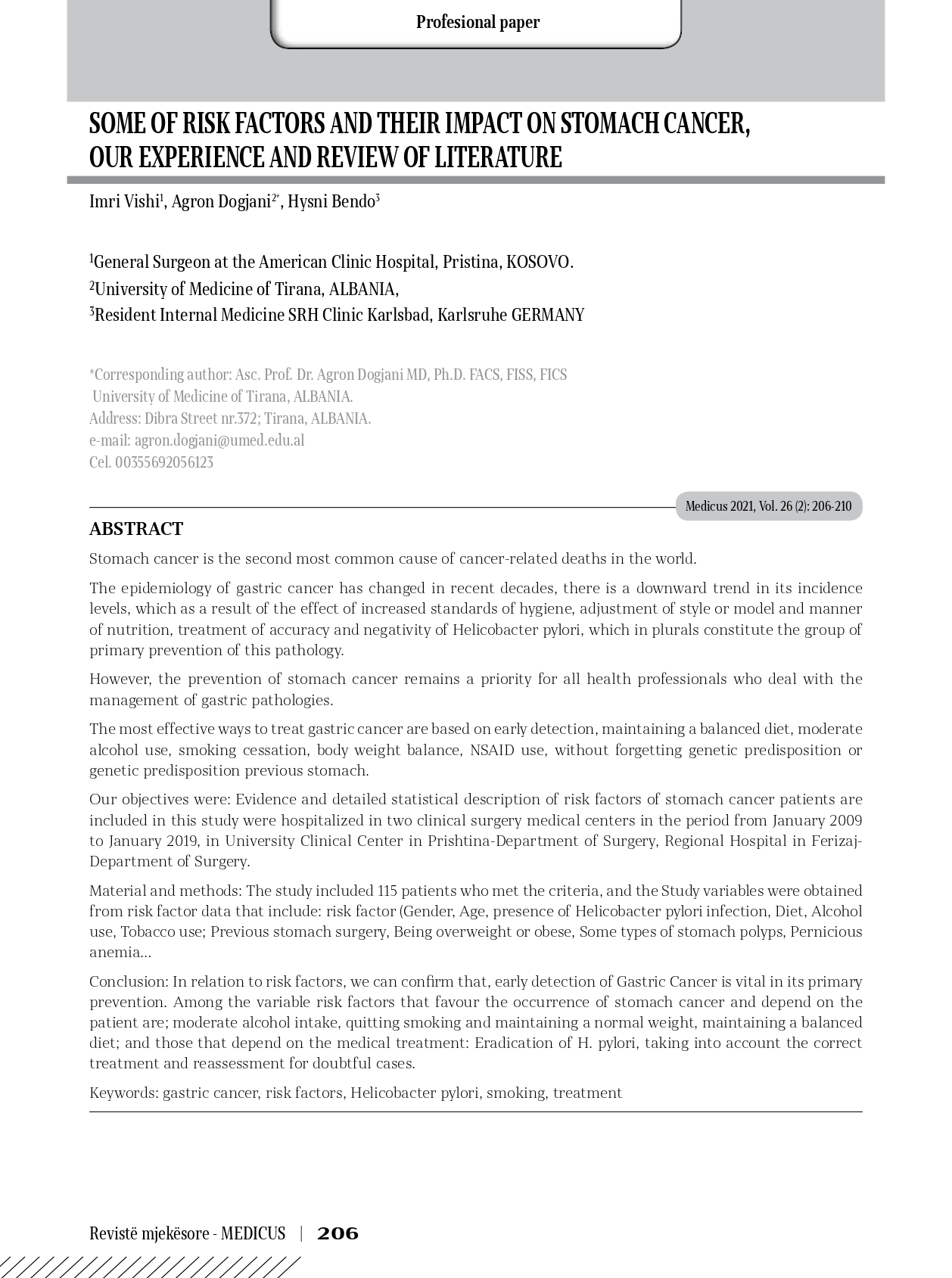 Some of risk Factors and their Impact on Stomach Cancer, our Experience, and Review of Literature.