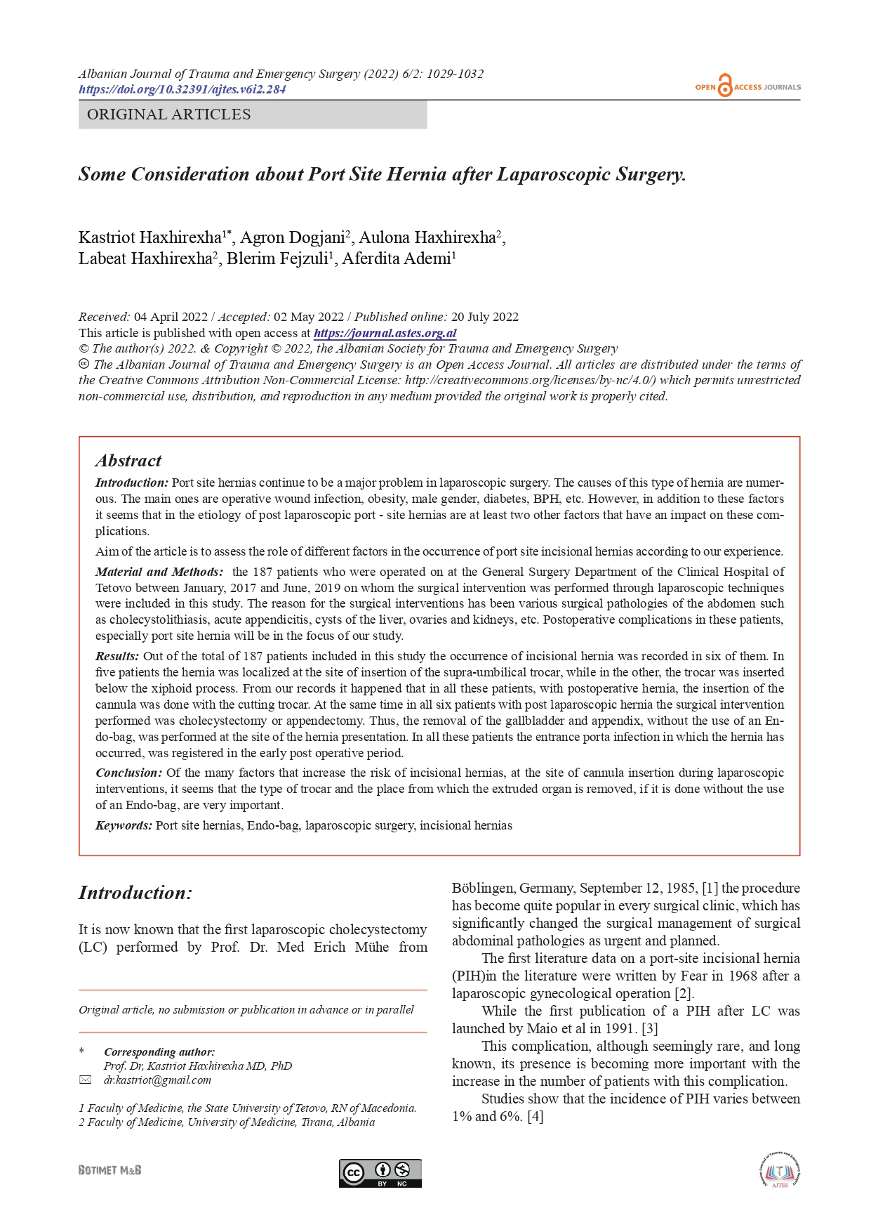 Results: Out of the total of 187 patients included in this study the occurrence of incisional hernia was recorded in six of them. In five patients the hernia was localized at the site of insertion of the supra-umbilical trocar, while in the other, the trocar was inserted below the xiphoid process. From our records, it happened that in all these patients, with a postoperative hernia, the insertion of the cannula was done with the cutting trocar. At the same time in all six patients with post laparoscopic hernia the surgical intervention performed was cholecystectomy or appendectomy. Thus, the removal of the gallbladder and appendix, without the use of an Endo-bag, was performed at the site of the hernia presentation. In all these patients the entrance porta infection in which the hernia has occurred was registered in the early postoperative period.