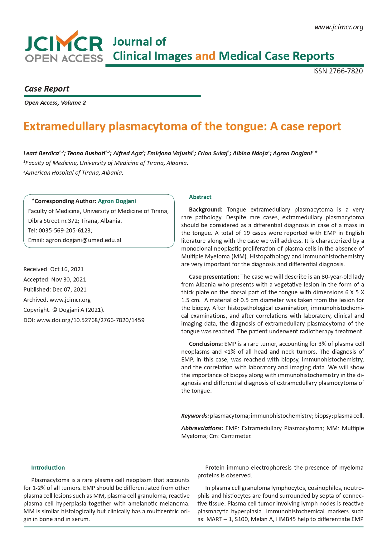 Case presentation: The case we will describe is an 80-year-old lady from Albania who presents with a vegetative lesion in the form of a thick plate on the dorsal part of the tongue with dimensions 6 X 5 X 1.5 cm. A material of 0.5 cm diameter was taken from the lesion for the biopsy. After histopathological examination, immunohistochemical examinations, and after correlations with laboratory, clinical, and imaging data, the diagnosis of extramedullary plasmacytoma of the tongue was reached. The patient underwent radiotherapy treatment
