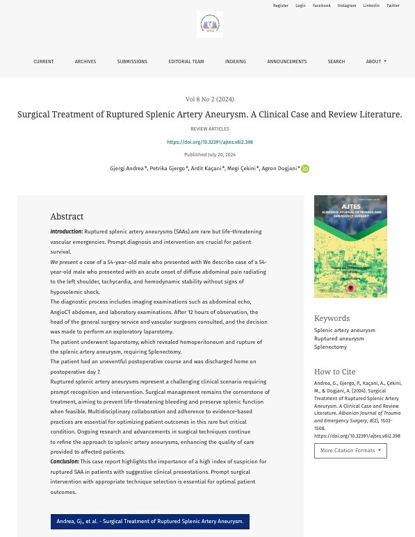 Surgical Treatment of Ruptured Splenic Artery Aneurysm. A Clinical Case and Review Literature.