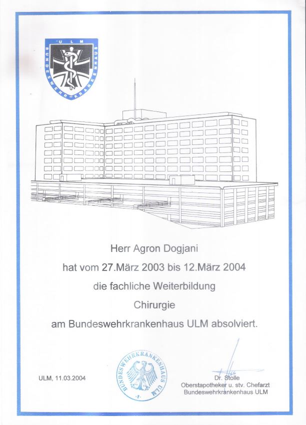 2003 - 2004 - Fellowship për Kirurgjinë "Thorako-vaskulare"