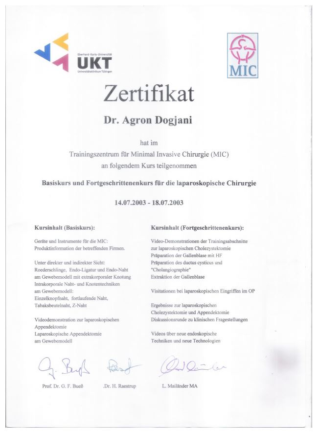 2003 - Kurs Bazë për Colonoscopy në GATE (Gastro - Enterologische – Kurse Trajnuese për Endoskopi)