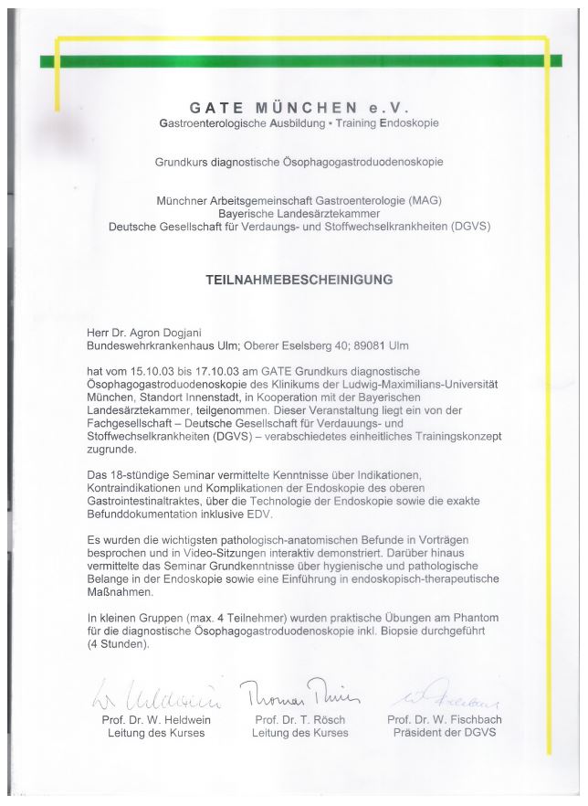 2003 - Kurs Bazë për Esophagus - Gastro - Duodenoscopy në GATE (Gastro - Enterologische – Kurse Trajnuese për Endoskopi)