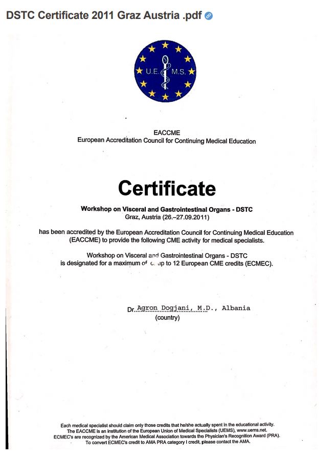2011 - DSTC Kurs në “Workshop on Visceral and Gastrointestinal Organs - DSTC (Definitive Surgical Trauma Course)”