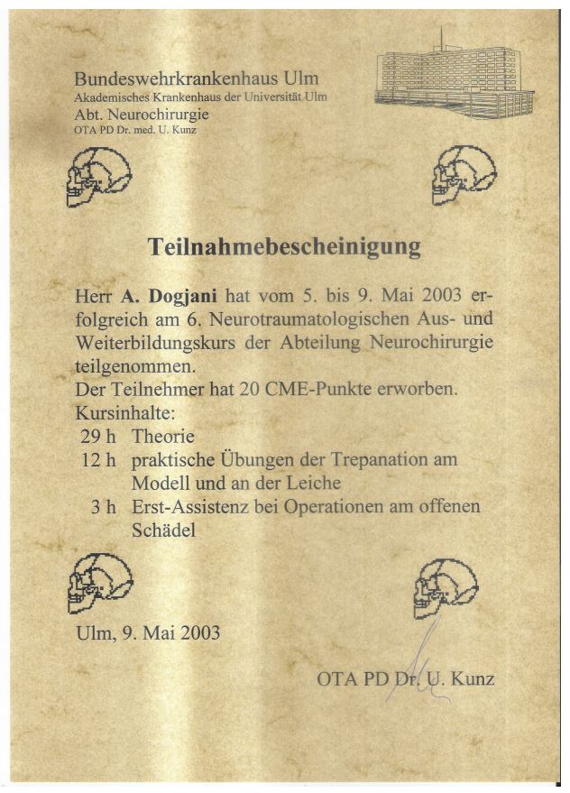 2003 - Kurs bazë për Trepanacionin, në Traumat e Kokës.